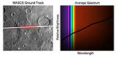 During its flyby of Mercury, the MESSENGER spacecraft acquired the first high-resolution spectra of the planet's surface in ultraviolet, visible, and near-infrared light. The image on the left shows a portion of the ground-track along which the Mercury Atmospheric and Surface Composition Spectrometer (MASCS) instrument accumulated over 650 observations of the surface. The depicted area is about 300 kilometers (190 miles) across. The white track covers about 60 of the MASCS "footprints" or spectral snapshots. The red area highlights about 20 footprints averaged to make the example spectrum on the right, showing the relative amount of sunlight reflected from the surface at wavelengths from the ultraviolet to the visible (rainbow) to the infrared. The observations were taken on January 14, 2008, beginning as the spectrometer's field of view crossed into the day-lit side of the planet at a distance of about 1,900 kilometers (about 1,200 miles), and continuing until the field of view left the planet at a distance of about 8,500 kilometers (about 5,300 miles) from Mercury. Mercury is about 4880 kilometers (about 3030 miles) in diameter, and the footprints shown here are about 1 by 5 kilometers (0.6 by 3.4 miles). The Mercury spectrum shows the degree to which different wavelengths of sunlight are absorbed or reflected by its surface materials. Dips in the spectrum indicate where sunlight shining on the surface is partially absorbed. The absorption bands' sizes and colors are diagnostic of the minerals in surface rocks. While Mercury has been observed telescopically from Earth for centuries, and Mariner 10 took images in one ultraviolet and two color filters when it flew by in 1974 and 1975, MESSENGER is the first mission to observe the surface with enough spatial and spectral resolution to determine Mercury's surface composition. Credit: NASA/Johns Hopkins University Applied Physics Laboratory/Carnegie Institution of Washington/Laboratory for Atmospheric and Space Physics, University of Colorado |