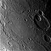 As the MESSENGER spacecraft approached Mercury on January 14, 2008, the Narrow Angle Camera (NAC) of the Mercury Dual Imaging System (MDIS) snapped this image of the crater Matisse. Named for the French artist Henri Matisse, Matisse crater was imaged during the Mariner 10 mission and is about 210 kilometers (130 miles) in diameter. Matisse crater is in the southern hemisphere and can be seen near the terminator of the planet (the line between the sunlit, day side and the dark, night side) in both the color and single-filter, black-and-white images released previously that show an overview of the entire incoming side of Mercury. On Mercury, craters are named for people, now deceased, who have made contributions to the humanities, such as artists, musicians, painters, and authors. The International Astronomical Union (IAU) oversees the official process of naming new craters and other new features discovered on bodies throughout the solar system. Scientists studying and mapping unnamed features can suggest names for consideration by the IAU. The 1213 images taken by MESSENGER during its first flyby encounter with Mercury cover a large region of Mercury's surface previously unseen by spacecraft, revealing many new craters and other features that will need to be named. Mission Elapsed Time (MET) of image: 108821375 Credit: NASA/Johns Hopkins University Applied Physics Laboratory/Carnegie Institution of Washington |
