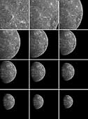 After MESSENGER completed its successful flyby of Mercury, the Narrow Angle Camera (NAC), part of the Mercury Dual Imaging System (MDIS), took images of the receding planet. Beginning on January 14, 2008, about 100 minutes after MESSENGER's closest pass by the surface of Mercury, until January 15, 2008, about 19 hours later, the NAC acquired one image every four minutes. In all, 288 images were snapped during this sequence; shown here are just 12 of those departing shots. The top left image was taken when MESSENGER was about 34,000 kilometers (21,000 miles) from Mercury, and the bottom right image was snapped from a distance of about 400,000 kilometers (250,000 miles). This large set of departing NAC images has been assembled into a movie, which will be shown tomorrow during a NASA press conference at 1 pm EST. Tune in tomorrow, via the web or NASA TV, to watch the NASA press conference, see this movie, and hear about the major discoveries made by MESSENGER from its historic flyby of Mercury! Mission Elapsed Times (MET) of images: 108830924, 108836684, 108842444, 108848204, 108853964, 108859724, 108865484, 108871244, 108877004, 108882764, 108888524, 108894284. Credit: NASA/Johns Hopkins University Applied Physics Laboratory/Carnegie Institution of Washington |