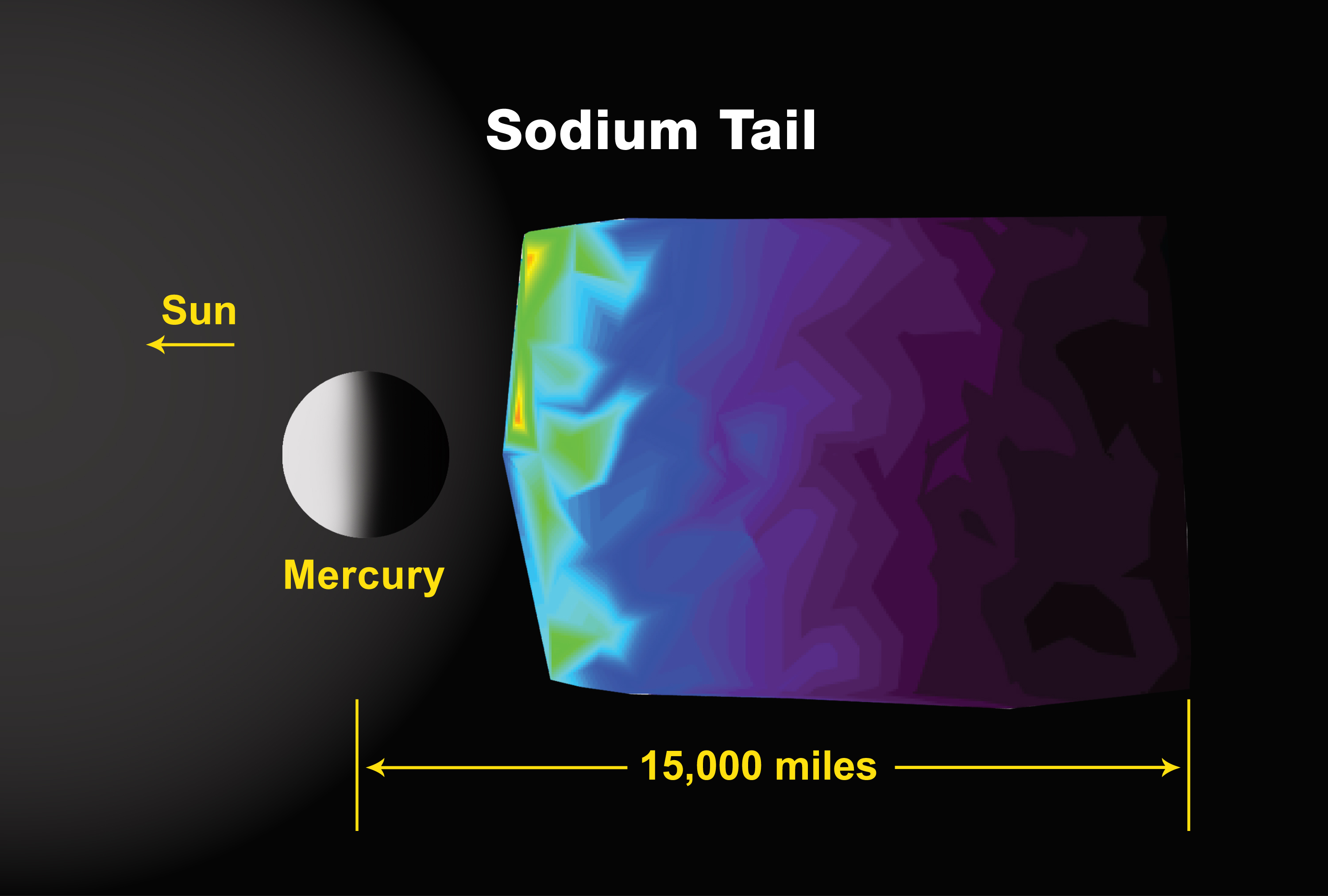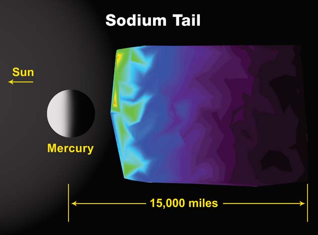 This plot shows the intensity of emission of light associated with sodium atoms in the vicinity of Mercury. The observations were made with the Ultraviolet and Visible Spectrometer (UVVS) section of the Mercury Atmospheric and Surface Composition Spectrometer (MASCS). The intensity (up to 40 kiloRayleighs) indicates the relative abundance of material, in this case sodium atoms, along the observational line of sight back to the spacecraft. While sodium from Mercury has been observed with Earth-based telescopes, this is the highest-spatial-resolution image ever made. The geometry and observing circumstances have to be disentangled to infer the true spatial distribution, but the observations do confirm a north-south asymmetry that has previously been observed in ground-based sodium images. The sodium emission is at 589 nm (in the visible part of the spectrum and the same wavelength, or color, as in sodium lamps and street lights on Earth). Because sodium atoms have intense emission, they are easy to detect, and this makes sodium a good tracer for other volatile elements in Mercury's exosphere. Credit: NASA/University of Colorado/Johns Hopkins University Applied Physics Laboratory/Carnegie Institution of Washington |