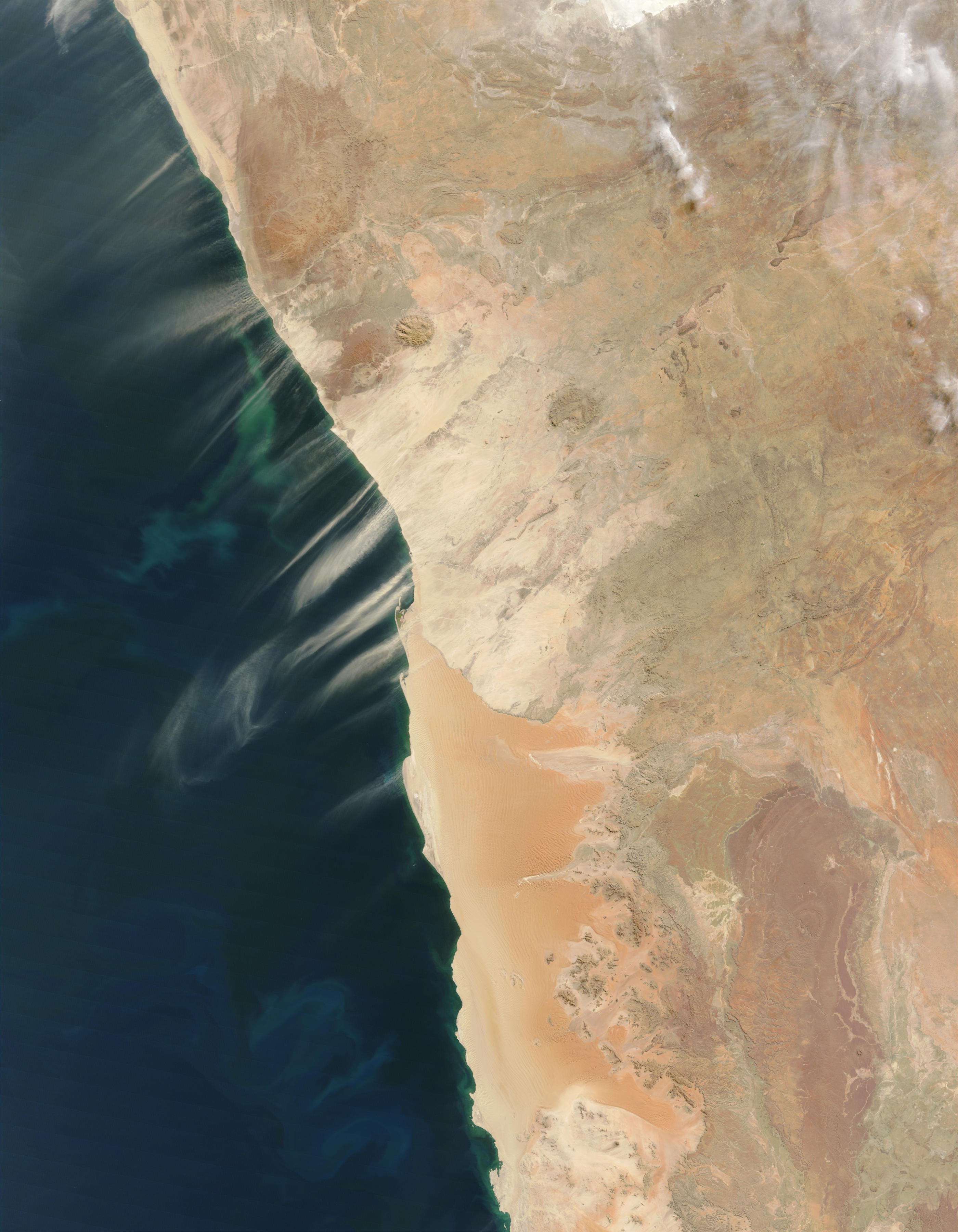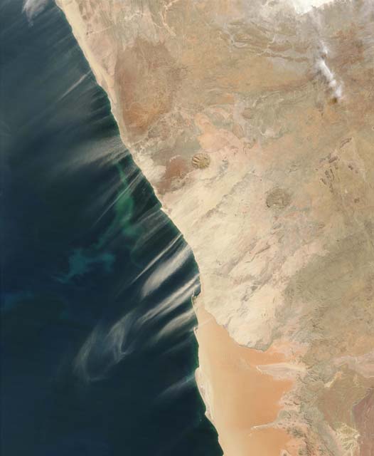 North of the soft orange sands of the Namib Desert, streamer of pale dust are streaming over Namibia´s Skeleton Coast in the Moderate Resolution Imaging Spectroradiometer (MODIS) from the Terra satellite on July 13, 2003. In the waters of the Atlantic Ocean, colorful swirls of blue and green suggest a bloom of tiny marine plants called phytoplankton. |