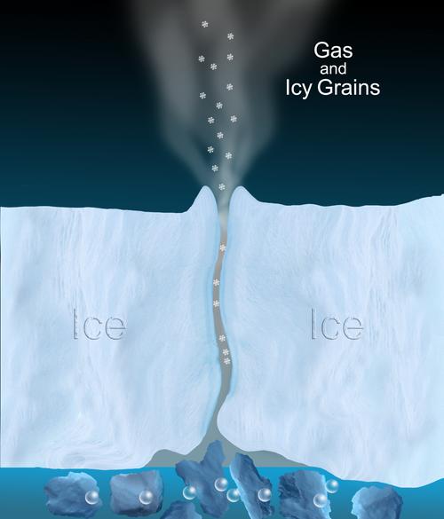 his graphic shows how the ice particles and water vapor observed spewing from geysers on Saturn's moon Enceladus may be related to liquid water beneath the surface. The large number of ice particles and the rate at which they are produced require high temperatures, close to the melting point of water. These warm temperatures indicate that there may be an internal lake of liquid water at or near the moon's south pole, where the geysers are present. This internal lake could be similar to Earth's Lake Vostok, where liquid water is locked in ice beneath Antarctica. The presence of liquid water inside Enceladus would have major implications for future studies of the possibility of life in the outer solar system. |