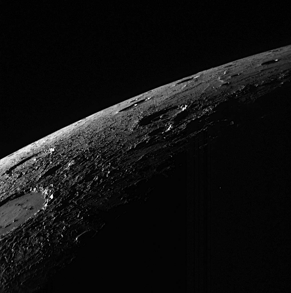 Date Acquired: October 6, 2008 This image was taken about 54 minutes before MESSENGER's closest approach to Mercury during the mission's second flyby of the innermost planet in the Solar System. The striking image shows a view looking over Mercury's horizon into the darkness of space. The surface in this image is located in the northern portion of the sunlit, crescent-shaped planet seen as the spacecraft approached Mercury. The low Sun angle creates distinct shadows, enhancing the visibility of the roughness of the surface, which is especially prominent for material ejected from, and surrounding, the impact crater cut by the left edge of this image. Credit: NASA/Johns Hopkins University Applied Physics Laboratory/Carnegie Institution of Washington |