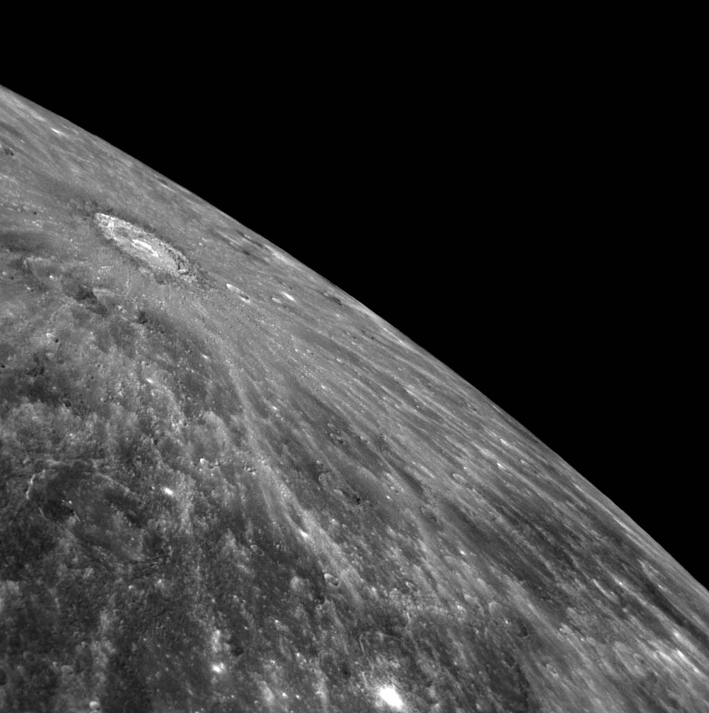Date Acquired: October 6, 2008 In one of the first images transmitted back to Earth following MESSENGER's second flyby of Mercury, an image of the entire departing planet, a spectacular and extensive system of rays can be seen. This NAC image shows a close-up view of the apparent source of those rays, a crater 110 kilometers (68 miles) in diameter located in the northern region of Mercury. The location of this bright crater is consistent with Earth-based radar images, which suggested a very fresh, rayed impact crater in this area. The amazing extent of this large ray system is visible for the first time in MESSENGER's newly acquired images. Credit: NASA/Johns Hopkins University Applied Physics Laboratory/Carnegie Institution of Washington |