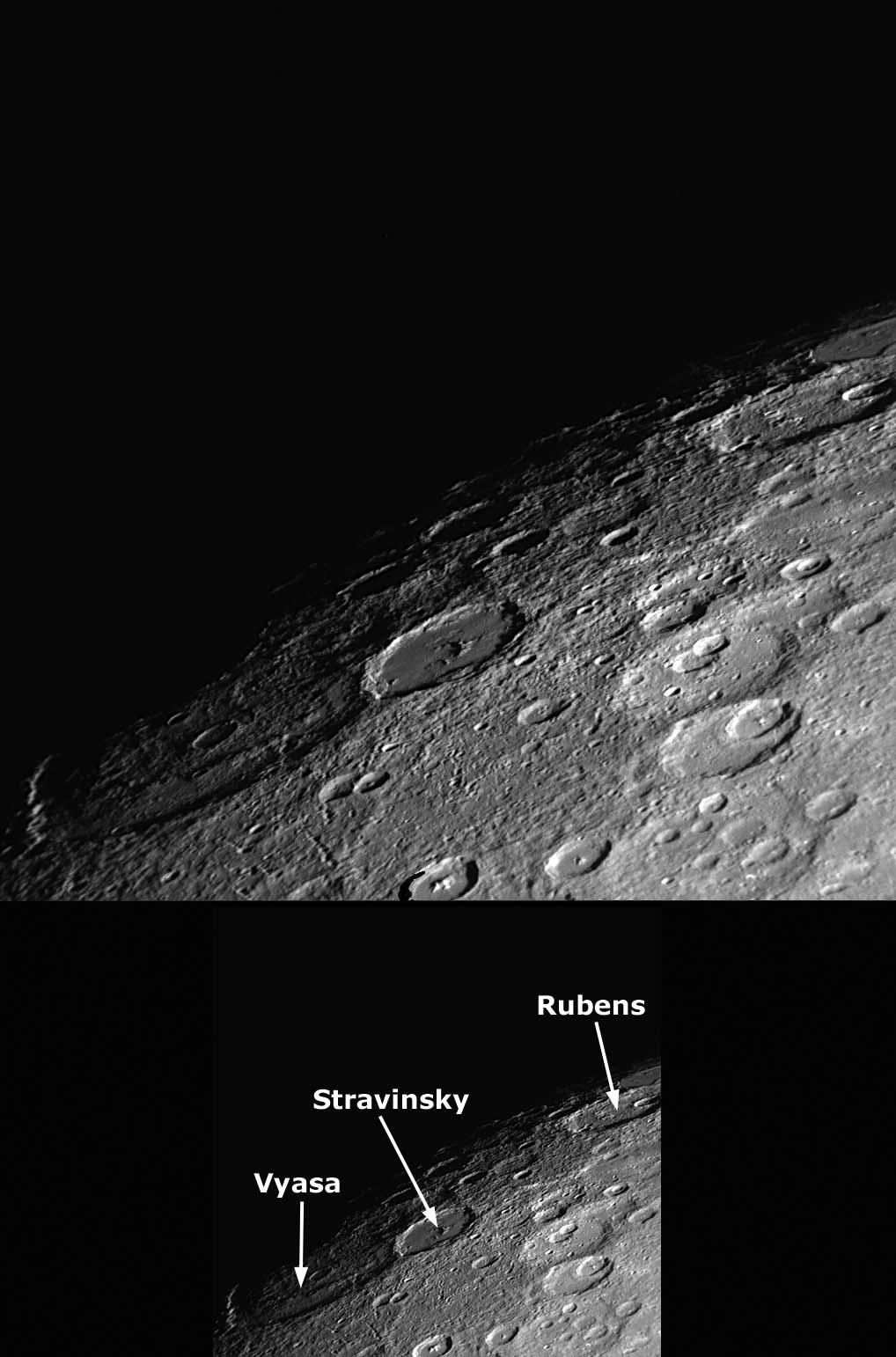 Date Acquired: October 6, 2008 By examining the characteristics of craters and their relationships to each other, geologists are able to unravel the history of Mercury. This image shows a northern portion of Mercury's surface, looking at the terminator (the transition from the sunlit dayside to the dark night side of the planet). The crater in the lower left, Vyasa, has a rough floor, with other craters superimposed onto it, indicating that this crater is relatively old. In contrast, the neighboring crater, Stravinsky, has a much smoother floor and appears to overlap the rim of Vyasa, suggesting that this crater is relatively younger. These craters appear to be aptly named to support this relative age relationship; Vyasa is named for the ancient Indian poet from about 1500 BC, while Igor Stravinsky was a 20th century Russian-born composer. The nearby crater Rubens, named for the 17th century Flemish painter, may indeed represent an event intermediate in time between Vyasa and Stravinsky. Credit: NASA/Johns Hopkins University Applied Physics Laboratory/Carnegie Institution of Washington |