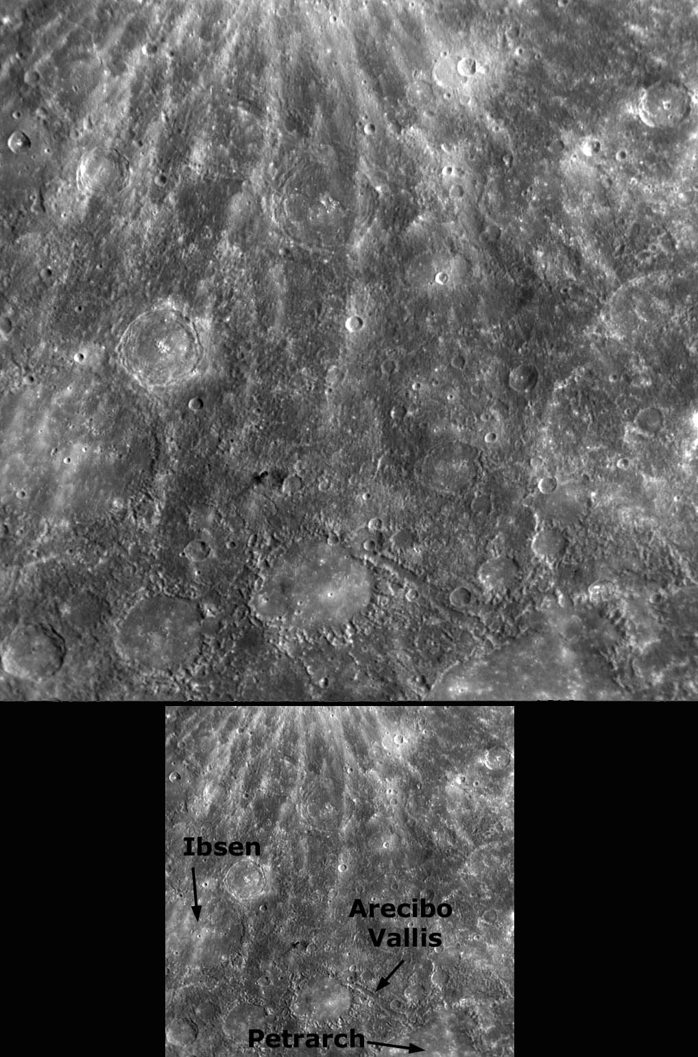 Date Acquired: October 6, 2008 About 69 minutes after MESSENGER's closest approach to Mercury during the mission's second flyby, the NAC acquired this image of a portion of Mercury's surface also seen during the Mariner 10 mission. Toward the lower portion f the image, Arecibo Vallis is visible. Vallis is the Latin word for valley, and valles (the plural of vallis) on Mercury are named for radio telescope observatories. Arecibo Observatory is located in Puerto Rico and has been used to conduct Earth-based studies of Mercury with important results, including the detection of radar-bright materials at Mercury's poles that may be water ice trapped in permanently shadowed craters. Arecibo also observed some bright, rayed craters that have now been better resolved by MESSENGER's latest images. Lately, Arecibo's unique radar capabilities have been threatened with closure due to changed funding priorities. The craters Ibsen (named for the Norwegian playwright) and Petrarch (named for the Italian poet) are also visible in this image. Bright rays from Kuiper crater extend down from the top of the image. Credit: NASA/Johns Hopkins University Applied Physics Laboratory/Carnegie Institution of Washington |