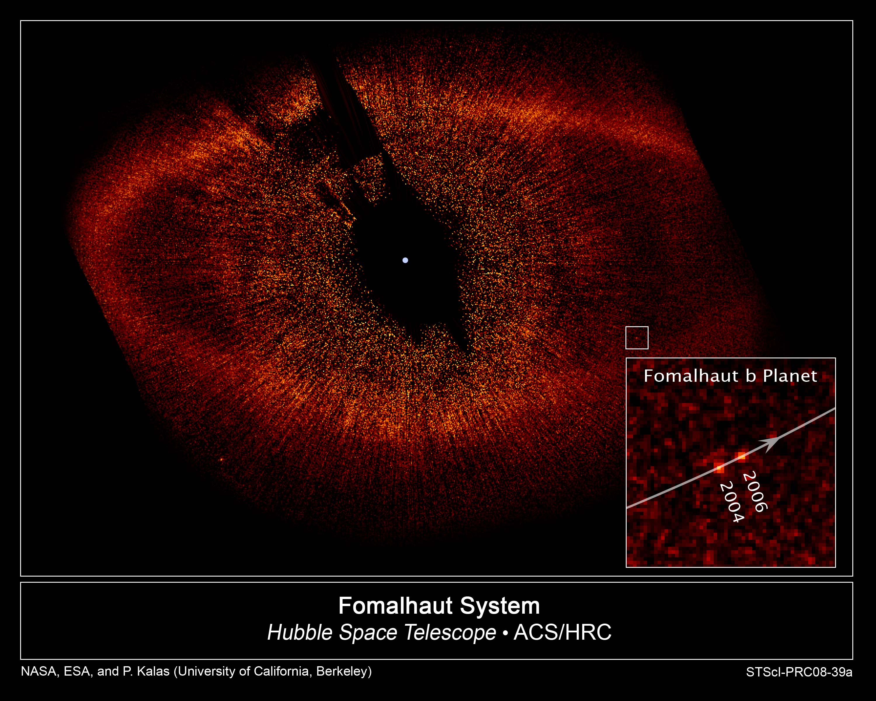 This image, taken with the Advanced Camera for Surveys aboard NASA's Hubble Space Telescope, shows the newly discovered planet, Fomalhaut b, orbiting its parent star, Fomalhaut. The small white box at lower right pinpoints the planet's location. Fomalhaut b has carved a path along the inner edge of a vast, dusty debris ring encircling Fomalhaut that is 21.5 billion miles across. Fomalhaut b lies 1.8 billion miles inside the ring's inner edge and orbits 10.7 billion miles from its star. The inset at bottom right is a composite image showing the planet's position during Hubble observations taken in 2004 and 2006. Astronomers have calculated that Fomalhaut b completes an orbit around its parent star every 872 years. The white dot in the center of the image marks the star's location. The region around Fomalhaut's location is black because astronomers used the Advanced Camera's coronagraph to block out the star's bright glare so that the dim planet could be seen. Fomalhaut b is 1 billion times fainter than its star. The radial streaks are scattered starlight. The red dot at lower left is a background star. The Fomalhaut system is 25 light-years away in the constellation Piscis Australis. This false-color image was taken in October 2004 and July 2006. Credit: NASA, ESA, P. Kalas, J. Graham, E. Chiang, E. Kite (University of California, Berkeley), M. Clampin (NASA Goddard Space Flight Center), M. Fitzgerald (Lawrence Livermore National Laboratory), and K. Stapelfeldt and J. Krist (NASA Jet Propulsion Laboratory) |