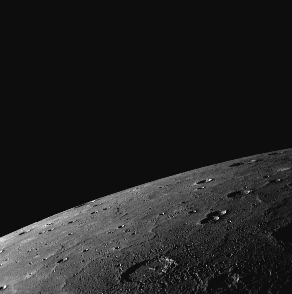 Date Acquired: September 29, 2009 During MESSENGER's approach to Mercury yesterday, the NAC acquired a high-resolution, 62-image mosaic of the sunlit crescent planet. Many of these images show portions of Mercury's surface not previously seen by spacecraft, including the NAC image shown here. In this image, Mercury's northern horizon cuts a crisp line against the blackness of space. The surface in the lower right corner of the image is near Mercury's terminator, the line between the light dayside and dark night side of the planet. Looking toward the horizon, smooth plains extend for large distances, similar to volcanic plains seen nearby during MESSENGER's second flyby of Mercury. Members of the MESSENGER Science Team are gathered today at the Johns Hopkins University Applied Physics Laboratory, discussing these high-resolution images in detail. Credit: NASA/Johns Hopkins University Applied Physics Laboratory/Carnegie Institution of Washington |