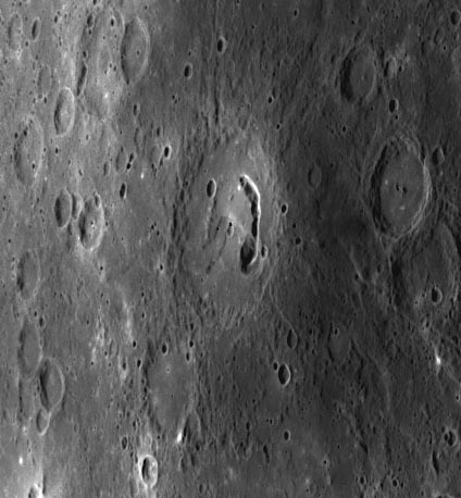 Date Acquired: September 29, 2009 The unnamed crater in the center of the image, viewed at close range for the first time yesterday during MESSENGER’s third flyby of Mercury, displays an arc-shaped depression known as a pit crater on its floor. This pit crater is similar to those seen in crater Beckett and crater Gibran imaged during MESSENGER’s first Mercury flyby in January 2008 and in crater Lermontov, observed by both Mariner 10 and by MESSENGER during its second flyby (October 2008). Impact craters on Mercury that host pit craters in their interiors have been named pit-floor craters. Unlike impact craters, pit craters are rimless, often irregularly shaped, and steep-sided, and they display no associated ejecta or lava flows but are typically distinctive in color. Thought to be evidence of shallow magmatic activity, pit craters may have formed when subsurface magma drained elsewhere and left a roof area unsupported, leading to collapse and the formation of the pit. In this example, the southern area of the pit appears to have two or more floor levels. The discovery of multiple pit-floor craters augments a growing body of evidence that volcanic activity was widespread in the geologic evolution of Mercury's crust. Credit: NASA/Johns Hopkins University Applied Physics Laboratory/Carnegie Institution of Washington |
