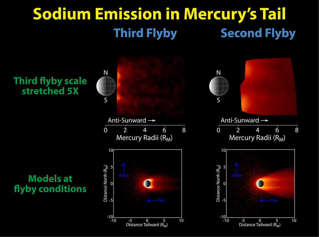 Comparison of the neutral sodium observed during the second and third Mercury flybys to models. The top left and right panels show the same images as in Image 2.2, but the color scale for the third flyby has been stretched to show the distribution of sodium more clearly. As in previous flybys, the distinct north and south enhancements in the emission that result from material being sputtered from the surface at high latitudes on the dayside are seen. The lower two panels show Monte Carlo models of the sodium abundance in Mercury's exosphere for conditions similar to those during the two flybys. These models illustrate that the "disappearance" of Mercury's neutral sodium tail is consistent with the change in conditions. Observations of the sodium exosphere and tail throughout Mercury's orbit during MESSENGER's orbital mission phase will enable such "seasonal" effects to be studied. Refinement of models similar to these will lead to an improved understanding of the source and loss processes and their variations among Mercury's different exospheric "seasons." Credit: NASA/Johns Hopkins University Applied Physics Laboratory/Carnegie Institution of Washington |