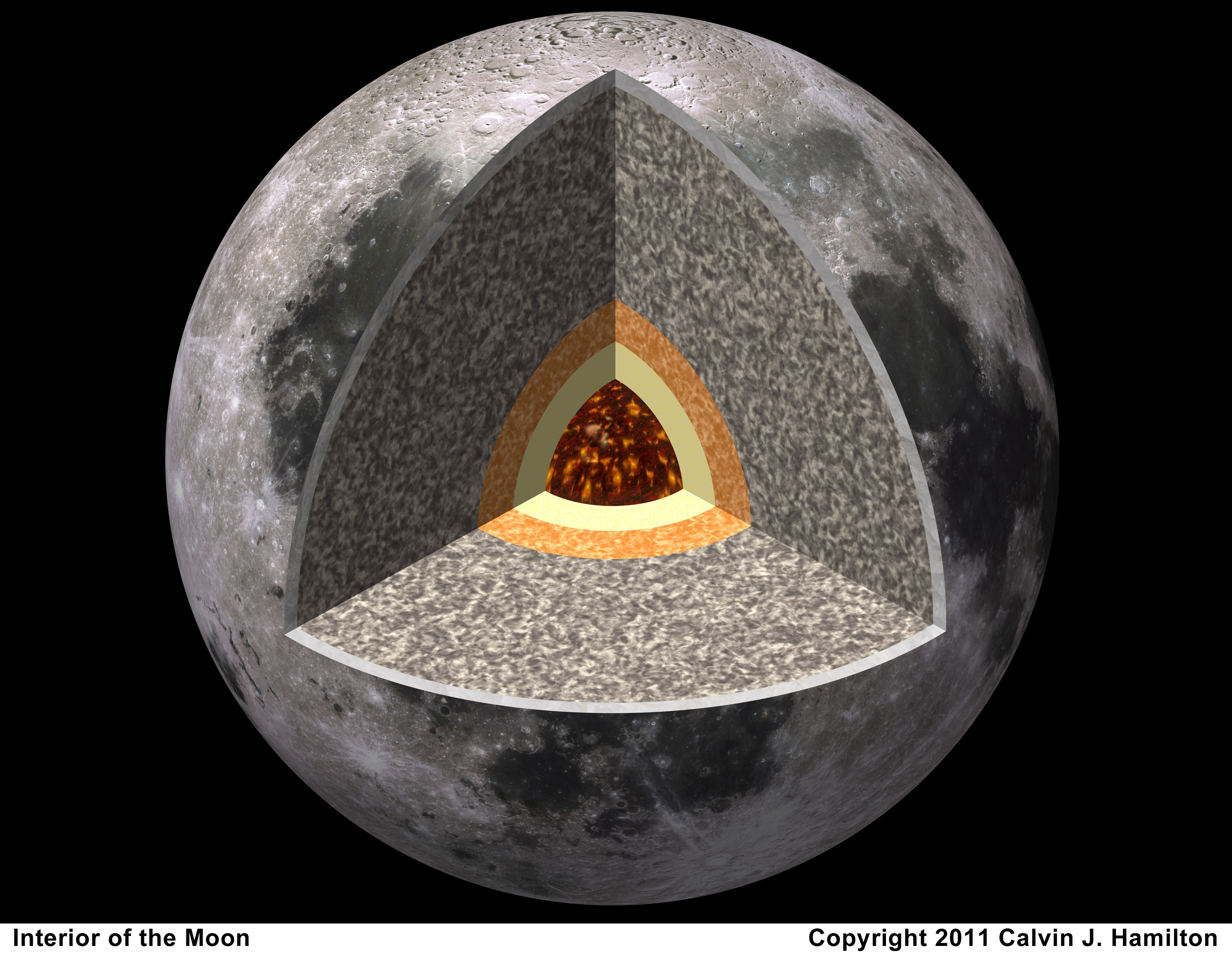 This artist's conception shows the interior of the moon based off of new research by NASA. The moon contains 5 major divisions in its interior. It possesses a solid, iron-rich inner core with a radius of nearly 150 miles and a fluid, primarily liquid-iron outer core with a radius of roughly 205 miles. It has a partially molten boundary layer around the core estimated to have a radius of nearly 300 miles followed by the mantle and then the crust. The moon's crust varies from tens of kilometers in depth (under mare basins) to more than 100 kilometers in some highland regions, with an average thickness of about 70 kilometers. |