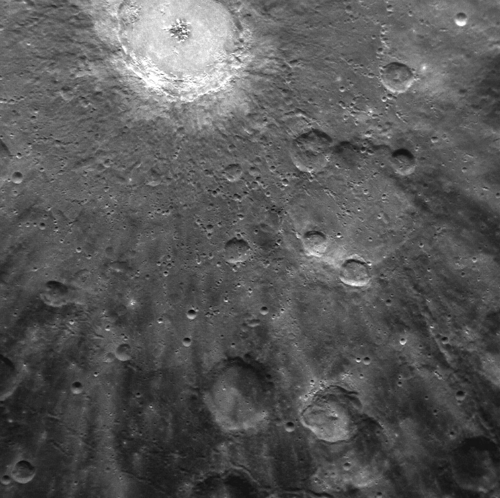 Date acquired: March 29, 2011 Of Interest: Bright rays, consisting of impact ejecta and secondary craters, spread across this NAC image and radiate from Debussy crater, located at the top. The image, acquired yesterday during the first orbit for which MDIS was imaging, shows just a small portion of Debussy's large system of rays in greater detail than ever previously seen. Images acquired during MESSENGER's second Mercury flyby showed that Debussy's rays extend for hundreds of kilometers across Mercury's surface. Debussy crater was named in March 2010, in honor of the French composer Claude Debussy (1862-1918). On March 17, 2011 (March 18, 2011, UTC), MESSENGER became the first spacecraft to orbit the planet Mercury. The mission is currently in its commissioning phase, during which spacecraft and instrument performance are verified through a series of specially designed checkout activities. In the course of the one-year primary mission, the spacecraft's seven scientific instruments and radio science investigation will unravel the history and evolution of the Solar System's innermost planet. Credit: NASA/Johns Hopkins University Applied Physics Laboratory/Carnegie Institution of Washington |