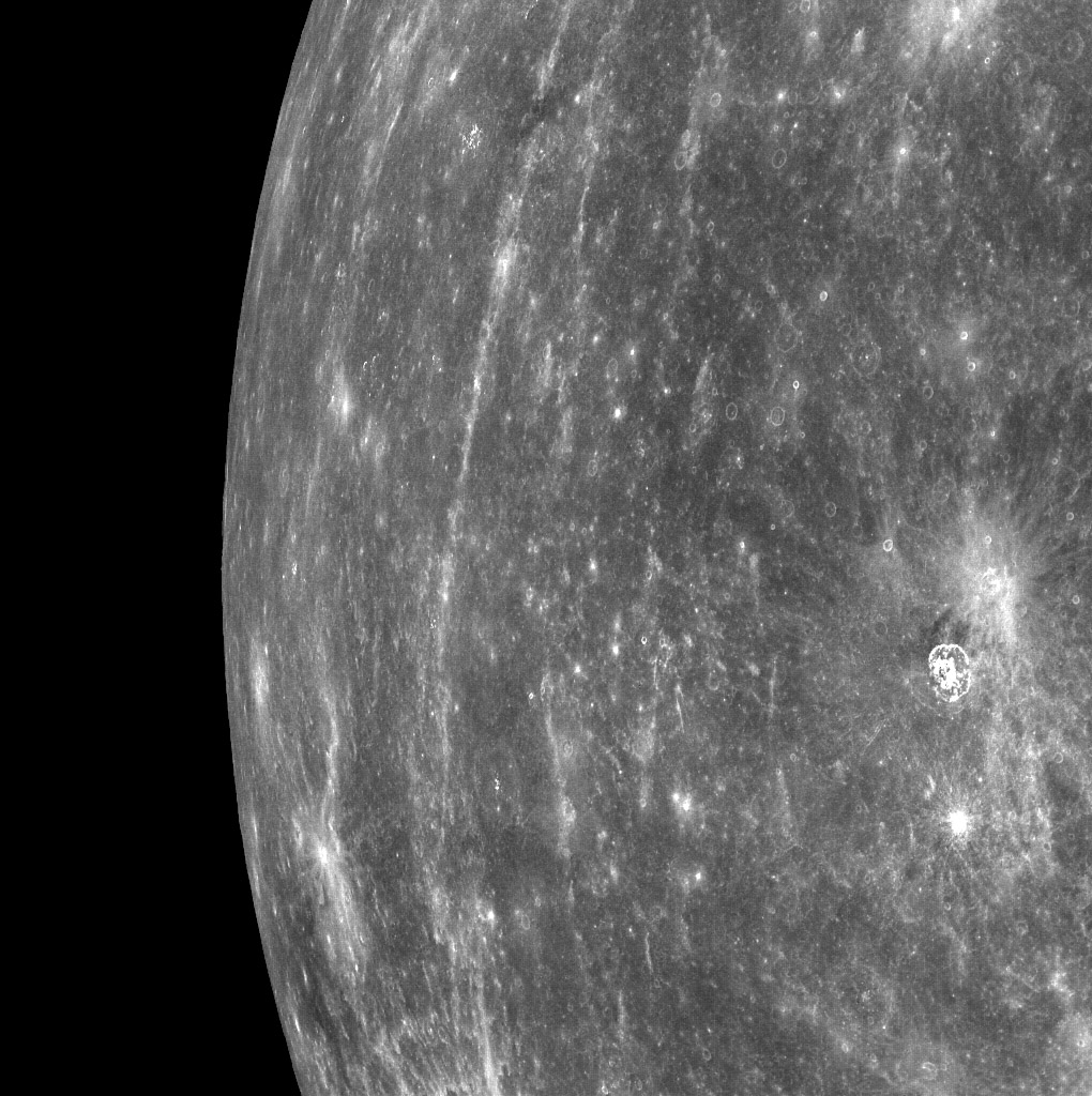 Date acquired: March 29, 2011 Of Interest: MESSENGER acquired this image of Mercury's horizon as the spacecraft was moving northward along the first orbit during which MDIS was turned on. Bright rays from Hokusai can be seen running north to south in the image. MDIS frequently acquired images that contained Mercury's horizon during the mission's three Mercury flybys. However, now that MESSENGER is in orbit about Mercury, views of Mercury's horizon in the images will be much less common. The field of view for MDIS will generally be filled with Mercury's surface as the instrument maps out the planet's geology in high resolution, stereo, and color. Occasionally, in order to obtain images of a certain portion of Mercury's surface, the horizon will also be visible. On March 17, 2011 (March 18, 2011, UTC), MESSENGER became the first spacecraft to orbit the planet Mercury. The mission is currently in its commissioning phase, during which spacecraft and instrument performance are verified through a series of specially designed checkout activities. In the course of the one-year primary mission, the spacecraft's seven scientific instruments and radio science investigation will unravel the history and evolution of the Solar System's innermost planet. Credit: NASA/Johns Hopkins University Applied Physics Laboratory/Carnegie Institution of Washington |
