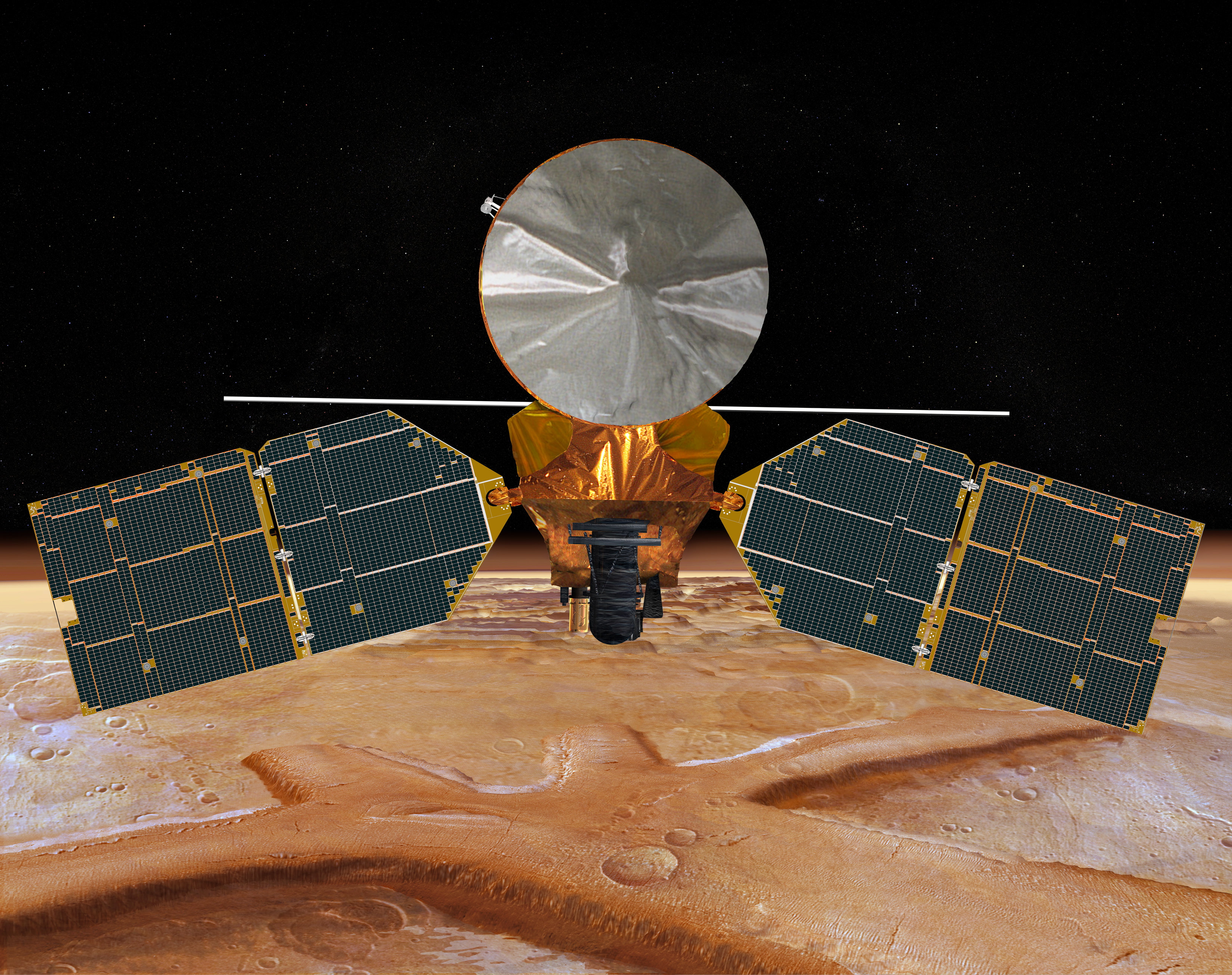 This artist's concept of the Mars Reconnaissance Orbiter features the spacecraft's main bus facing down, toward the red planet. The large silver circular feature above the spacecraft bus is the high-gain antenna, the spacecraft's main means of communicating with both Earth and other spacecraft. The long, thin pole behind the bus is the SHARAD antenna. Seeking liquid or frozen water, SHARAD will probe the subsurface using radar waves at a 15-25 MHz frequency band, "seeing" in the first few hundreds of feet (up to 1 kilometer) of Mars' crust. The large instrument (covered in black thermal blanketing) in the center is the HiRISE camera. This powerful camera will provide the highest-resolution images from orbit to date. The other easily visible instruments are: the Electra telecommunications package which is the gold-colored instrument directly left of the HiRISE camera. It will act as a communications relay and navigation aid for Mars spacecraft. To the right of the HiRISE camera is the Context Imager (CTX). |