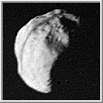 Epimetheus [ep-eh-MEE-thee-us] is the fifth satellite of Saturn. It was discovered by R. Walker in 1980. Epimetheus was the son of Iapetus and brother to Prometheus and Atlas. Epimetheus means hindsight in Greek. It has an irregular shape with a size of 144x108x98 kilometers (89x67x61 miles) in diameter. It is traversed by several large and small grooves, valleys and ridges. Several craters larger than 30 km can be seen on its surface. The pervasive cratering indicates that its surface must be several billion years old. The above image shows the shadow of Saturn's F Ring crossing its surface.