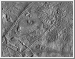 The icy surface of Europa, one of the moons of Jupiter, was photographed by the Galileo spacecraft on its fourth orbit around Jupiter. The area shown here is about 77 miles (124 kilometers) by 115 miles (186 kilometers) across and shows features as small as a half a mile (800 meters) across. Thick, lobate flows, the first seen on Europa or any of the icy satellites of Jupiter, are visible in several areas, including the lower right quarter of the picture where one flow cuts across a prominent ridge. Most of the ridges on the left side of the picture appear to be partly buried or subdued by flows. The ice-rich surface of Europa suggests that the flows might also be ice, perhaps erupted onto the surface from the interior as viscous, glacierlike masses.