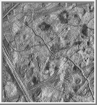 A flat smooth area about 3.2 kilometers (2 miles) across is seen in the left part of the picture. This area resulted from flooding by a fluid which erupted onto the surface and buried sets of ridges and grooves. The smooth area contrasts with a distinctly rugged patch of terrain farther east, to the right of the prominent ridge system running down the middle of the picture. The rugged patch of terrain is 4 kilometers (2.5 miles) across and represents localized disruption of the complex network of ridges in the area. Eruptions of material onto the surface, crustal disruption, and the formation of complex networks of folded and faulted ridges show that significant energy was available in the interior of Europa. Although small impact craters are most easily seen in the smooth area, they occur throughout the ridged terrain seen in this view.