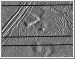 A section of a triple band crosses the upper left of the picture and extends for hundreds of miles across the surface. Triple bands derive their name from their appearance at lower resolution as a narrow bright band flanked by a pair of darker bands. At the high resolution of this picture, however, the triple band is much more complex and is composed of a system of ridges 6 kilometers (4 miles) across. Some ridges reach heights of about 180 meters (200 yards). Other features include a hill in the center of the picture about 480 meters (500 yards) high. Two mounds about 6 kilometers across (4 miles) are seen in the bottom of the picture. The ridges, hills and mounds probably all represent uplifts of the icy crust of Europa by processes originating from the interior.