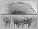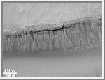The layer from which the gullies emanate has recessed backward to form an overhang beneath a harder layer of rock. The larger gullies have formed an alcove--an area above the overhang from which debris has collapsed to leave a dark-toned scar. Below the layer of seepage is found a dark, narrow channel that runs down the slope to an apron of debris. The small, bright, parallel features at the base of the cliff at the center-right of the picture is a series of large windblown ripples.