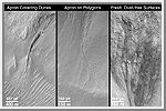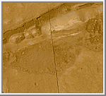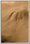 The first picture, "Apron Covering Dunes," shows a deep, prominent martian gully in a south-facing wall in Nirgal Vallis near 29.4°S, 39.1°W. Sunlight illuminates the scene from the upper left. At the bottom of the picture is a series of evenly-spaced, almost parallel ridges. These ridges are dunes created by windblown sand. The apron--the fanlike deposit at the lower end of the deep channel--at this location is seen covering some of the dunes. The sand dunes are thus older than the apron of debris that came from the channel. The dune field has no small meteor impact craters on it, so it, like the gully landforms, is geologically young--yet older than the apron. If the dunes are active in the modern environment--which is uncertain despite the apparent youth of the dunes--then the apron would have had to form within the past few centuries or less. This picture was taken in September 1999.