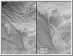 The north wall of the small crater has many narrow gullies eroded into it. These are hypothesized to have been formed by flowing water and debris flows. Debris transported with the water created lobed and finger-like deposits at the base of the crater wall where it intersects the floor (bottom center top image). Many of the finger-like deposits have small channels indicating that a liquid--most likely water--flowed in these areas. Hundreds of individual water and debris flow events might have occurred to create the scene shown here. Each outburst of water from higher up on the crater slopes would have constituted a competition between evaporation, freezing, and gravity.