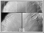 The first picture (above left) is a composite of three different high resolution MOC views obtained in 1999 and 2000. The second picture (above right) shows the location of the high resolution views relative to the whole crater as it appeared in the highest resolution image previously acquired of the area, taken by the Viking 1 orbiter in 1978. The release image (top) shows a close-up of one of the channels and debris aprons found in the northwestern quarter of the impact crater.