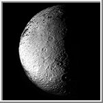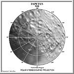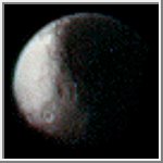 Iapetus [eye-AP-i-tus] is one of the stranger moons of Saturn. Its density is similar to that of Rhea, indicating that it has a small allotment of rocky materials. Its leading side is dark with a slight reddish color while its trailing side is bright. The dark surface might be composed of matter that was either swept up from space or oozed from the moon's interior. The real reason is still unknown. The dark material might be a thin layer of organic material perhaps similar to the complex substances found in the most primitive meteorites. However, there are no bright rimed craters present on the dark hemisphere. If the dark material is thin, it must be constantly renewed since a meteor impact would punch through the layer to reveal brighter surface material.