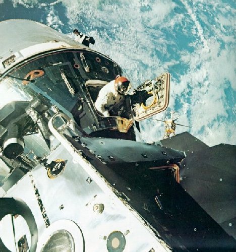| Gleaming in the sunlight, Spider and Gumdrop are hard-docked while two of the three-man crew venture outside. CM pilot Dave Scott, breathing through an umbilical connection, pokes his head out the command-module hatch. The picture was taken by LM pilot Rusty Schweickart (who wore an independent life-support pack) while perched on the lunar module's "front porch". |