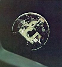 | Its legs folded up for launch, the lunar module looked like this as the command module eased in to dock and draw it free from the third stage of the Saturn launch vehicle. |