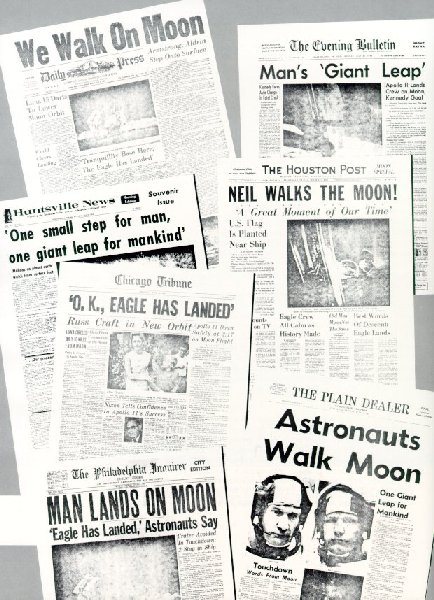 | No one knew it when Columbus first stepped on Watlings Islands, but every headline writer was challenged by the first manned Moon landing. The full newspaper coverage suggested by these front pages was just a part of it. Considering the nearly worldwide radio and television coverage, it has been estimated that half the population of the planet was aware of the events of Apollo 11. |