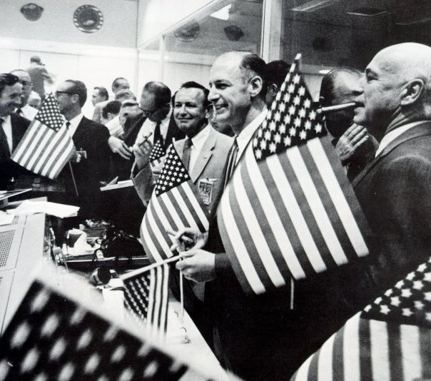 | Relief and jubilation greeted the safe splashdown of Apollo 11 . "Many of us still can't believe that the goal we set out to achieve in 1961 has been achieved", said George Low; and some of the parties that night have entered folklore. From right above - Gilruth, Low, Kraft, Phillips (looking down), and Mueller (partly behind flog). |