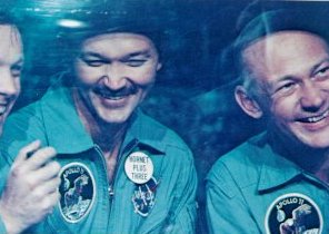 | Aboard the Hornet in their quarantine trailer on the hangar deck, three buoyant astronauts chaff with the President of the United States. Compare their expressions here with those in the photographs before launch on this page. |
