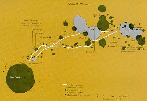| The planned traverse route for the second EVA is shown by a fine black line an this map of the Apollo 14 site. The heavier white line is the traverse actually covered. The craters and boulders encountered are plotted, as are the locations of the emplaced experiments. Such maps are essential for an understanding of the sample sources and the experiment data. |
