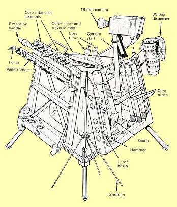 | The well-stocked tool rack at left, which fitted neatly on the rickshaw, was at least better than traipsing about carrying everything, including samples already collected. But it proved to be a drag in deep dust, easier to carry than to tow. The problem of doing on-the-spot lunar geologising in an efficient way awaited the electric Rover. |