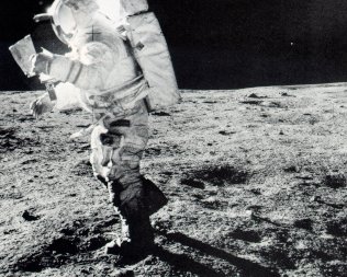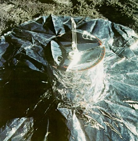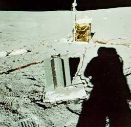 | The Passive Seismic Experiment is completely hidden by its many-layered shroud of aluminized Mylar. The top of the thermal shroud is the platform for the bubble level and Sun compass that the astronaut used to orient the experiment initially. An internal set of leveling motors keeps the seismometers constantly level within a few seconds of arc. Seismic motions are recorded on Earth with a magnification factor of 10 million. The network created by the four ALSEPs that have this experiment enables seismologists to locate moonquakes in three dimensions, and to study the seismic velocities and propagation characteristics of subsurface materials. |