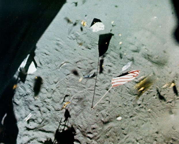 | The flag flutters an the Moon in the genuine wind of a rocket exhaust as the ascent stage of the Apollo 14 lunar module Antares lifts off from the Moon. Pieces of the gold-coated insulating foil turn off the descent stage by the blast were also sent flying. Who knows how many thousands of years will pass before a wind of vaporized rock from some nearby meteorite impact once more sets this flag flapping? |