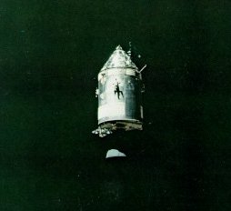 | In the blackness of space, the Apollo 14 command-service module Kitty Hawk gleams brilliantly as it draws near the camera in the lunar module Antares. The single-orbit rendezvous procedure, used for the first time in lunar orbit on this mission, brought the two craft together in two hours. After crew transfer, Antares was guided to lunar impact at a point between the Apollo 12 and 14 sites. The resulting seismic signal, recorded by both instruments, lasted 1 1/2 hours. |