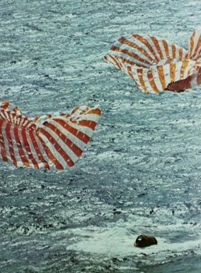 | At its journey's end, the Apollo 14 command module splashes down into the sparkling South Pacific, some 900 miles south of Samoa. The parachutes collapse as they are freed of their load. On this occasion, the command module remained right side up in the water after landing. Like a kayak, a command module was just as stable in the water when it was upside-down (stable two). If it toppled over to an inverted position, as happened on other splashdowns, the crew could right it by means of inflatable airbags. |