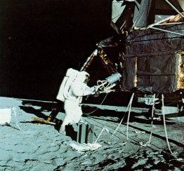 | Apollo 14 Astronaut Shepard fits a core tube section to the extension handle in preparation for taking a vertical sample of the subsurface material. Core tubes were among the handtools carried on the MET. |