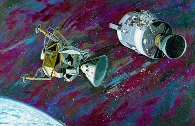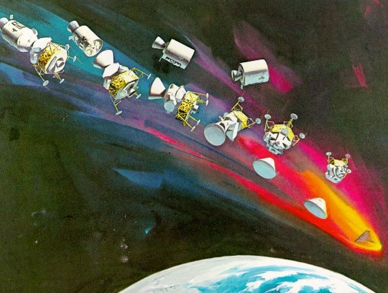 | The jettisoning of elements during the critical last hours of the Apollo 13 mission is shown in this sequence drawing. When the lifesaving LM was shoved off by tunnel pressure about an hour before splashdown, everyone felt a surge of sentiment as the magnificent craft peeled away. Its maker, Grumman, later jokingly sent a bill for more than $400,000 to North American Rockwell for "towing" the CSM 300,000 miles. |