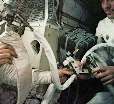| "Backroom" experts at Mission Control worked many hours to devise the fix that possibly kept the astronauts from dying of carbon dioxide. CapCom Joe Kerwin led Astronaut Swigert, step by step, for an hour to build a contraption like the one the experts had constructed on Earth. It involved stripping the hose from a lunar suit and rigging the hose to the taped-over CM double canister, using the suit's fan to draw carbon dioxide from the cabin through the canister and expel it back into the LM as pure oxygen. |