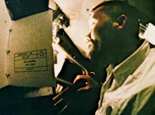 | In the darkened, power-short spacecraft, temperature dropped to 38° F. Lovell and Haise donned their lunar boots, Swigert an extra suit of underwear. Water condensed on the cabin walls and windows frosted. Food was refrigerator-cold. |