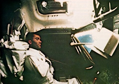 | Haise dozes with his hands restrained to keep his weightless arms from flopping about. In the cold gloom, one crew member stayed on watch at all times. Stay-awake pills helped during the final hours as the Earth came whistling at them like a freight train. |
