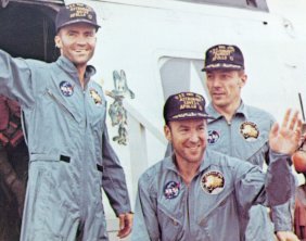 | Haise, Lovell, and Swigert step off the recovery helicopter to the Iwo Jima in the South Seas. The crew lost a total of 31.5 pounds; Lovell alone 14 pounds - records in both cases. Dehydroted and exhausted, Haise was invalided three weeks by infection. |