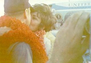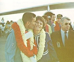 | In Honolulu Lovell is joyously united with wife Marilyn after she and Mary Haise and bachelor Swigert's parents had flown from Houston with President Nixon. During the Apollo 8 mission sixteen months earlier, Lovell had nicknamed a crater on Moon "Mount Marilyn". |