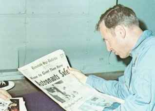 | "We didn't realize the complete magnitude of this flight", said Lovell, "until we got back home and started reading about it." Christian Science Monitor said: "Never in recorded history has a journey of such peril been watched and waited-out by almost the entire human race." |