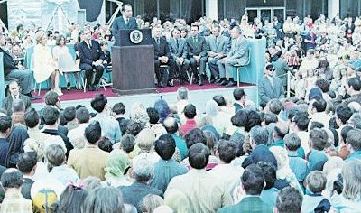 | In Houston the 37th President pays tribute to the men who performed miracles in Mission Control to save Apollo 13. To President's right are NASA Administrator Thomas Paine and Mrs. Nixon. To his left: Flight directors Eugene Kranz, Gerald Griffin, Milton Windler (the fourth, Glynn Lunney, is behind lectern), then Chief Astronaut Donald K. Slayton, James A. Lovell III (in uniform), and Sigurd Sjoberg, Director of Flight Operations, who in behalf of "the ground" received the Nation's highest award, Medal of Freedom. |