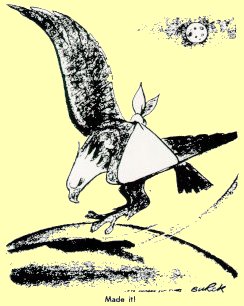 | A collective sigh of relief rose from the millions following the drama of Apollo 13 when the Odyssey splashed down. The CM-shaped bandage on this eagle cleverly depicts the flight home. "Only in a formal sense will Apollo 13 go into history as a failure", editorialized The New York Times. |