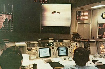 | A beautiful sight! Two flight controllers at the Mission Control Center watch the parachute deployment as Odyssey floats down toward a gentle landing in the Pacific near American Samoa. Splashdown, at 1:07 p.m. EST, brought down the curtain on the most harried and critical emergency of the entire manned space program. |