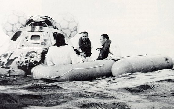 | The charred command module splashed down less than four miles from the recovery ship USS Iwo Jima. Three very tired, hungry, cold, dehydrated astronauts await a ride up into the recovery helicopter. They were aboard the recovery ship less than one hour after touching down in the Pacific. |